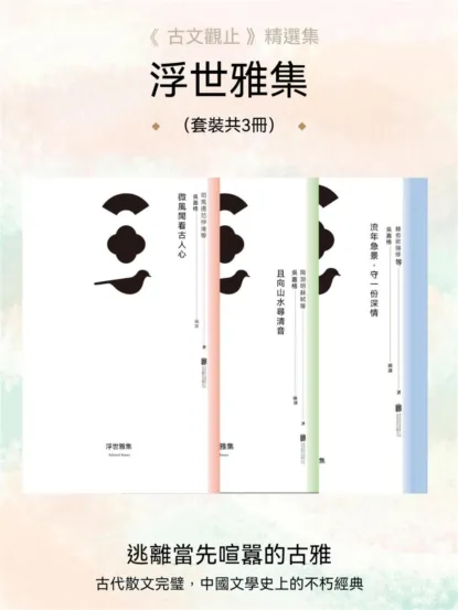 《浮世雅集》是一套古典散文精選集,套書精心遴選《古文觀止》中流傳不衰的歷代文豪閒雅散文精品,根據內容重新編目,結《微風閑看古人心》《流年急景,守一份深情》《且向山水尋清音》三集,從古人品格氣節、情誼和山水等方面,引領讀者體驗古文之美,感受古人情懷、體會古人雅趣,得一份逃離現實喧囂的古雅。