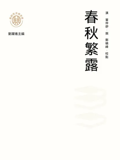 《春秋繁露》共十七卷,八十二篇。篇名和《漢書·藝文志》及董仲舒本傳所記載的不盡相同,後人疑其不盡出自董仲舒一人之手。董仲舒推崇公羊學,闡發"春秋大一統"之旨,雜糅儒家思想和五行學說,對自然和人事作各種比附,建立比較系統的"天人感應"論。此書注本有清淩曙《春秋繁露注》、蘇輿《春秋繁露義證》等。本次整理以清嘉慶二十年蜚雲閣刻本為底本,整理者對原文進行了精細點校,並在導言中全面梳理了該書的創作背景、主要內容、時代價值、版本流傳情況等,能夠為讀者提供一個理想的閱讀版本。