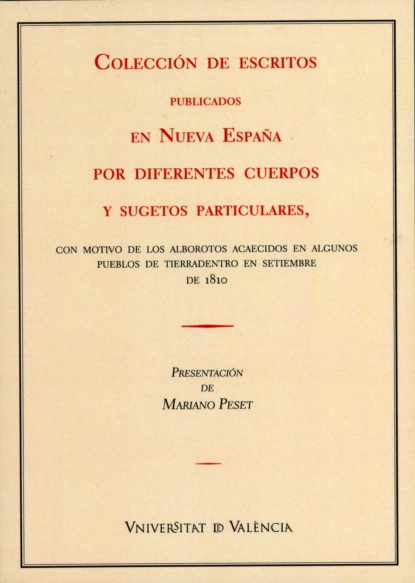 En 1810 la insurgencia de Miguel Hidalgo en Dolores iniciaba, durante la guerra contra el francés, el grito de independencia de México. Diferentes autoridades e instituciones de Nueva España se apresuraron a manifestar su condena del levantamiento y la fidelidad a la monarquía. La universidad de México, el rector y el claustro, se unió a la condena de Hidalgo y los otros insurgentes que pretendían separar a los españoles americanos de los españoles peninsulares. Estas proclamas universitarias y otros escritos contrarios a la sublevación, fieles a la monarquía borbónica, se reunieron en un volumen publicado en la ciudad de Valencia en 1811. La reedición facsímil de estos textos permite conocer los argumentos con que las autoridades de Nueva España trataron de frenar la independencia de México.